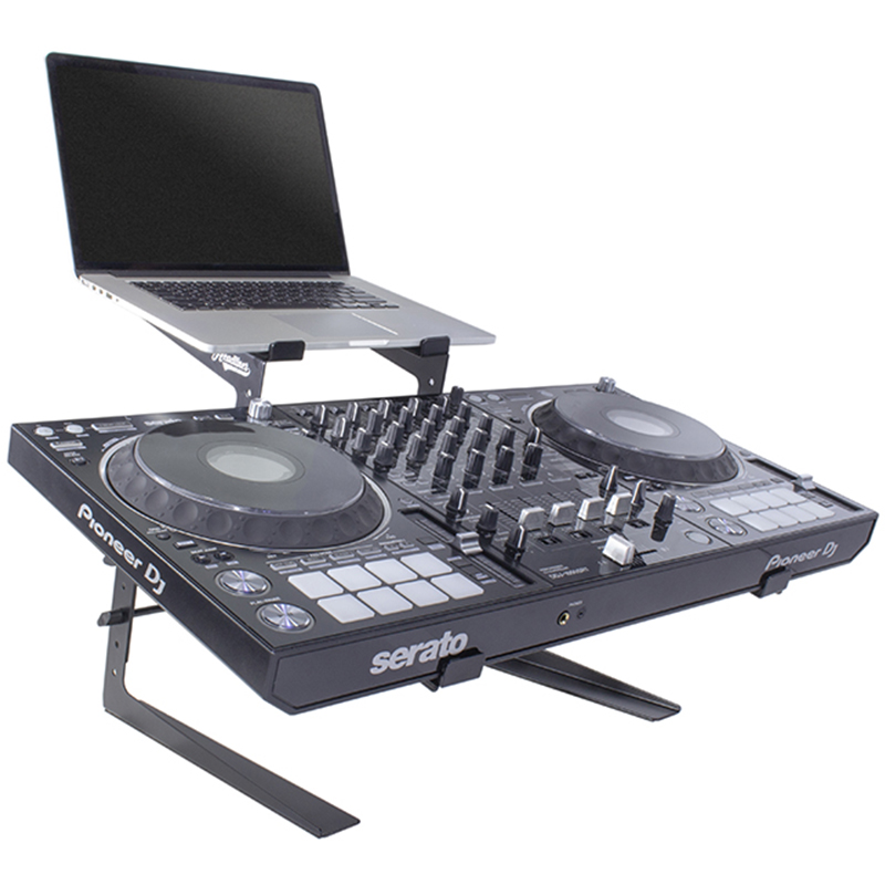 El estante inferior tiene capacidad para controladores de DJ de tamaño medio, como Pioneer DDJ-SR2 o NI Kontrol S4 MK3, o controladores de DJ más grandes, como Pioneer DDJ-1000SRT o XDJ-RX, extendiendo los brazos retráctiles. En el estante superior cabe un portátil de cualquier tamaño o controladores más pequeños como Ableton Push 2, NI Maschine o Akai MPK225. Los brazos y las patas del soporte están forrados con un acolchado de goma antideslizante para una mayor estabilidad y fiabilidad.