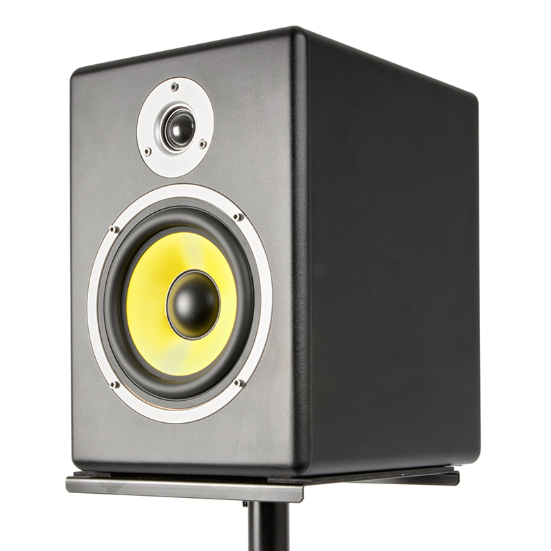 Pie triangular VONYX SMS15 para monitor ajustable en 3 pasos con pasador de seguridad y gran tornillo de fijación. Incluye puntas de contacto a suelo y una plataforma metálica de apoyo con 2 tiras de goma antideslizante. Útil para casa, aplicaciones y estudio.