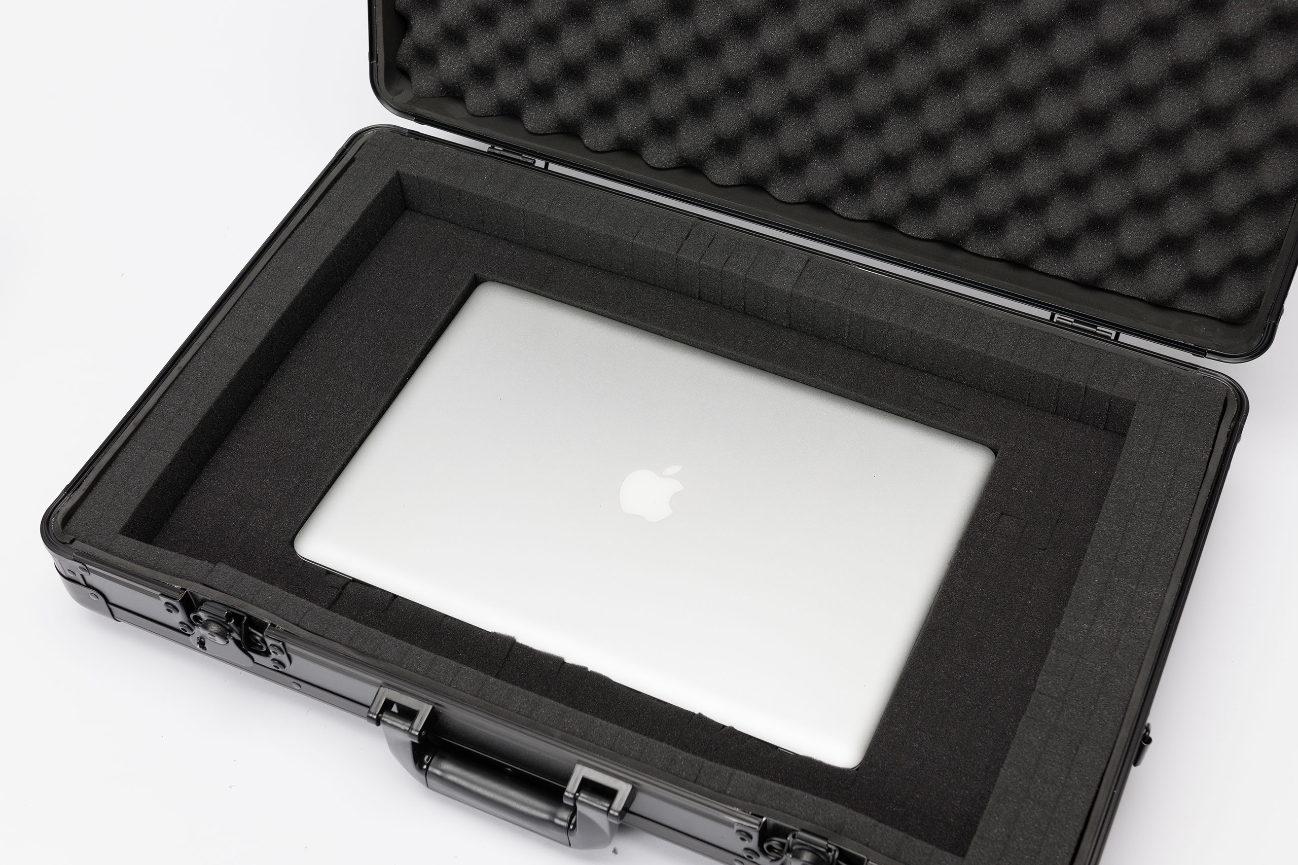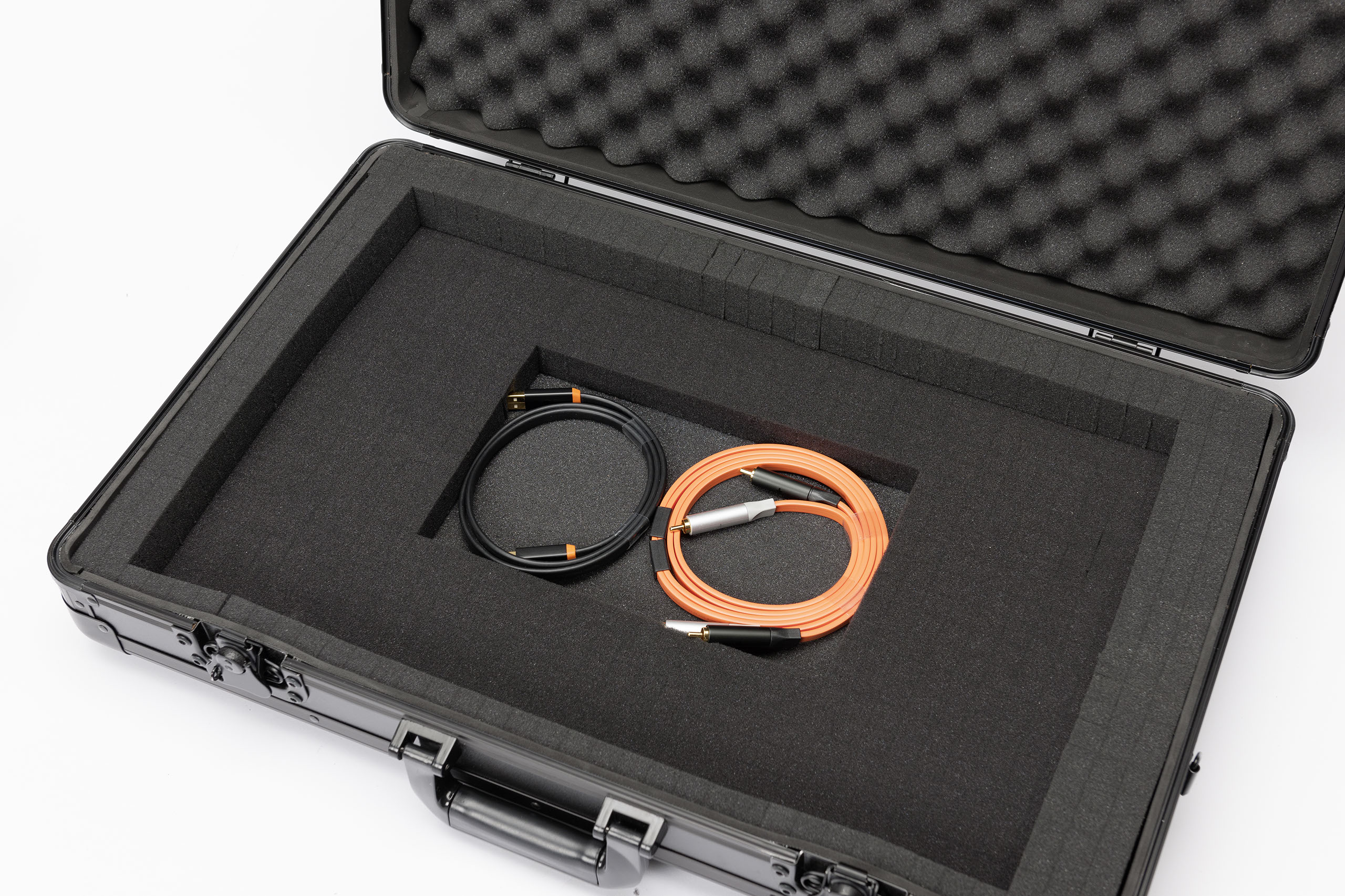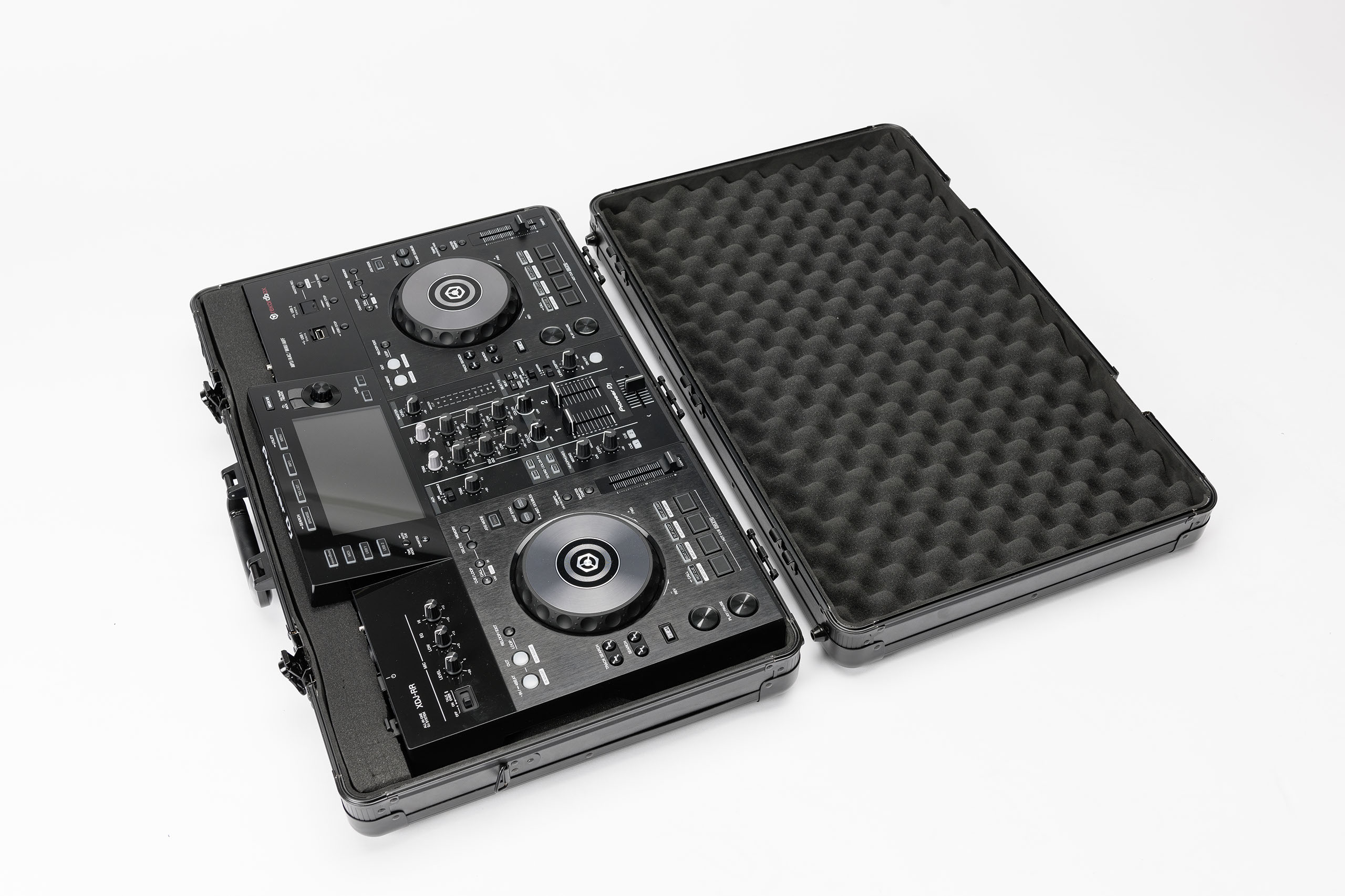 Construido en MDF laminado, perfilería de aluminio anodizado y cierres de mariposa (pueden asegurarse con candado). Interior completamente acolchado con espuma EVA de 5mm y espuma con relieve de 3 cm de grosor en la tapa. Incluye espumas desmontables de 2 capas (2,5 y 3,5 cm) para crear compartimentos individuales para controladores, mezcladores de batalla, portátiles o pequeños accesorios. Incluye tapa desmontable. Cómoda asa de transporte y opción de montar correa.