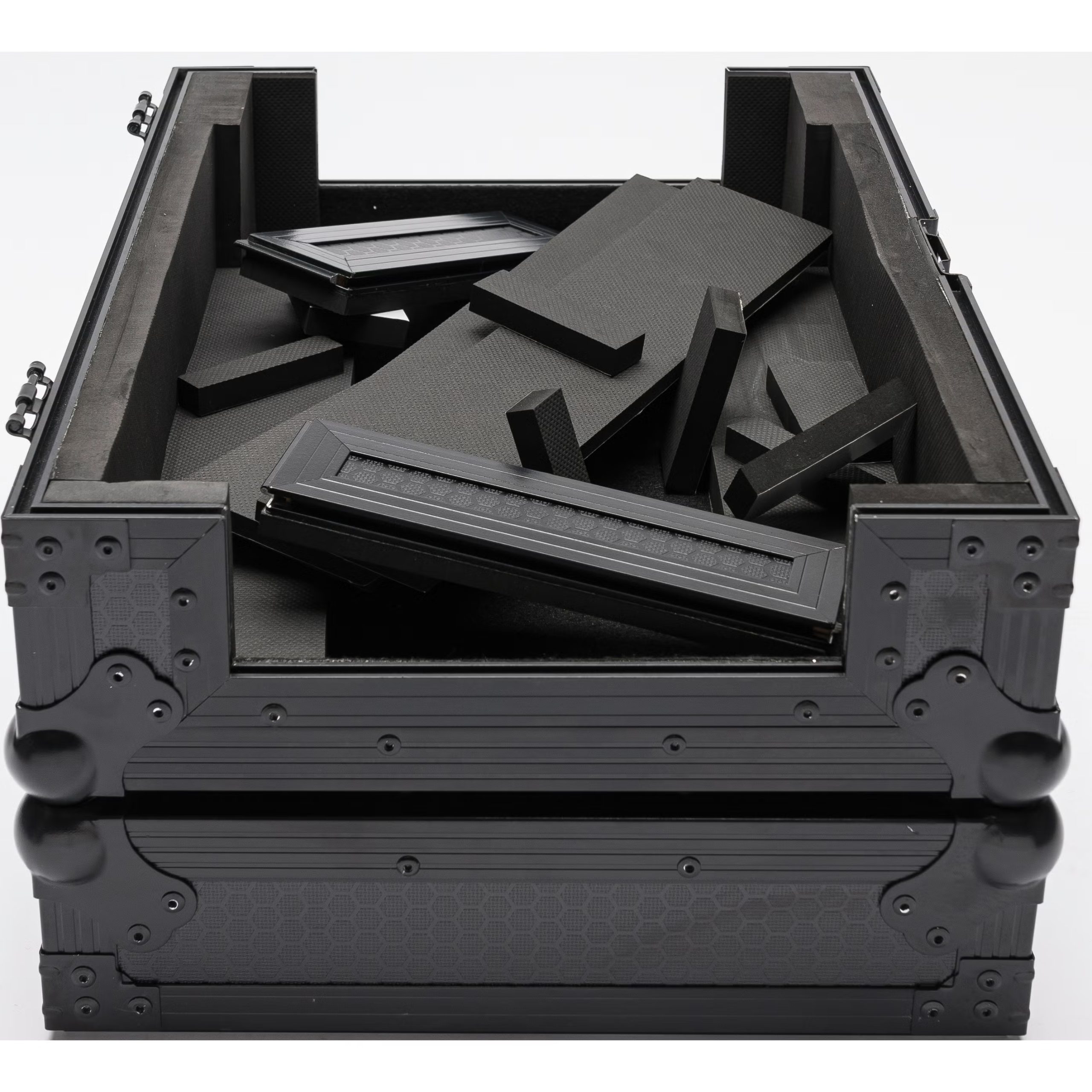 Flightcase para transporte y almacenaje de reproductor o mezclador. Construcción resistente de contrachapado laminado de vinilo de 9 mm. Perfiles de aluminio sólido y cierres con resorte. Tiras de espuma adicionales para adaptarse a varios modelos de equipos. Cubiertas removibles en el panel frontal y trasero. Interior completamente acolchado. Esquinas de bolas apilables.