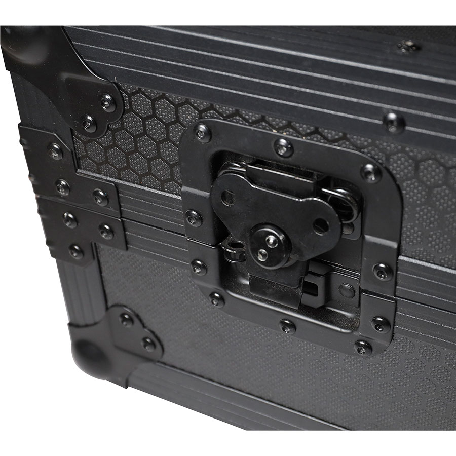 Flight case construido en madera contrachapa sólida de 9mm y nueva superficie exterior de escenario con acabado hexagonal tipo nido de abeja de máxima duración. Las partes internas están protegidas con acolchado protector de espuma EVA. Esta espuma acolchada de diferentes densidades protege el equipo de golpes y otros daños.