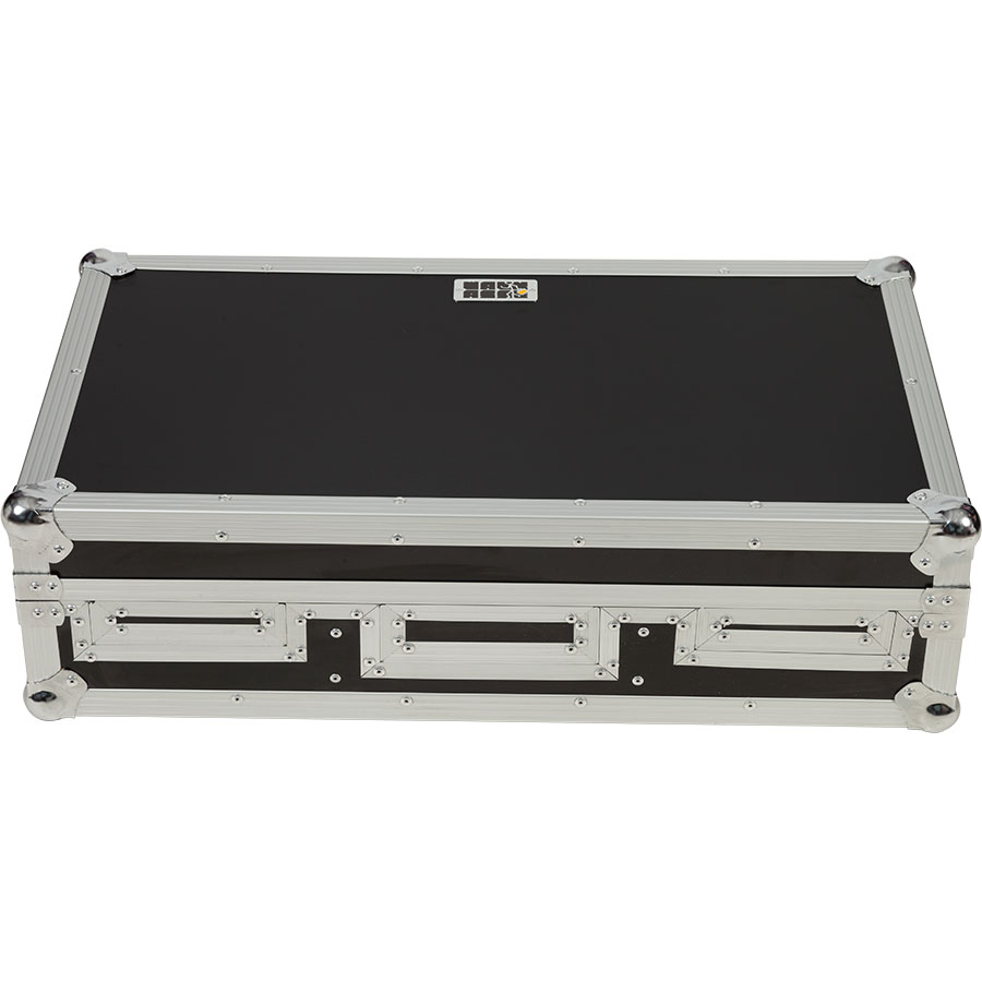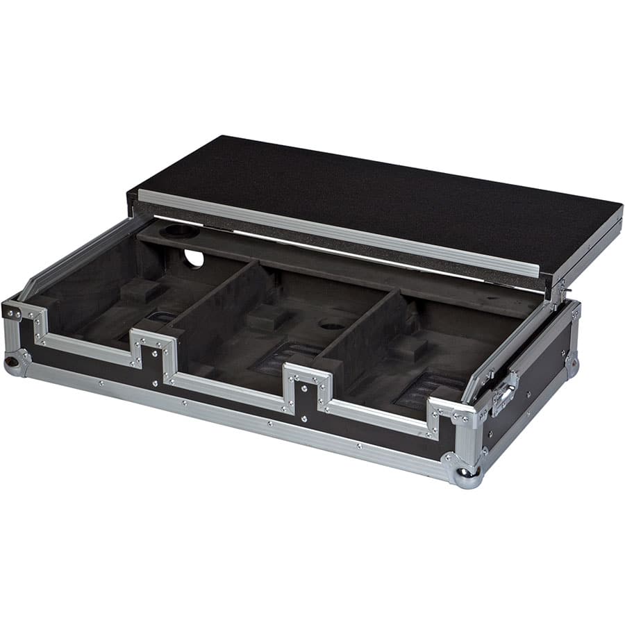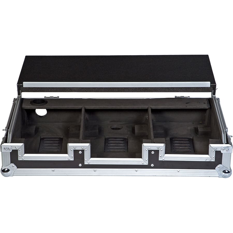 Flight case construida con láminas de 6/9mm de Plywood. Tapa extraíble para su fácil acceso, con posibilidad de colocación debajo de la unidad principal para aumentar la altura. Acabado interior con foam de diferentes densidades. Soporte de gran dimensión con puerto pasa cables, con acabado en aro de plástico, completamente extraíble de la maleta. Puerto GL de evacuación de calor para prevenir fallos de funcionamiento durante la reproducción.