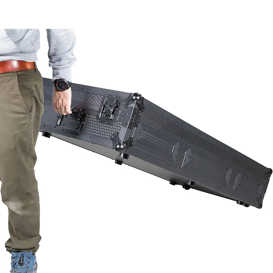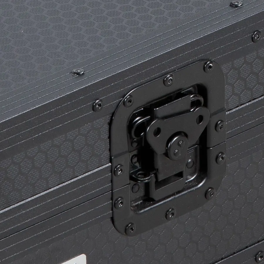 Nuestros modelos están fabricados con contrachapado resistente de 9 mm de grosor y recubiertos con un laminado exterior en acabado negro antideslizante con diseño hexagonal tipo panal de abeja, pensado para resistir las condiciones más exigentes en giras y escenarios.