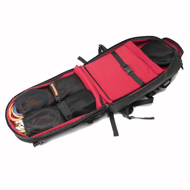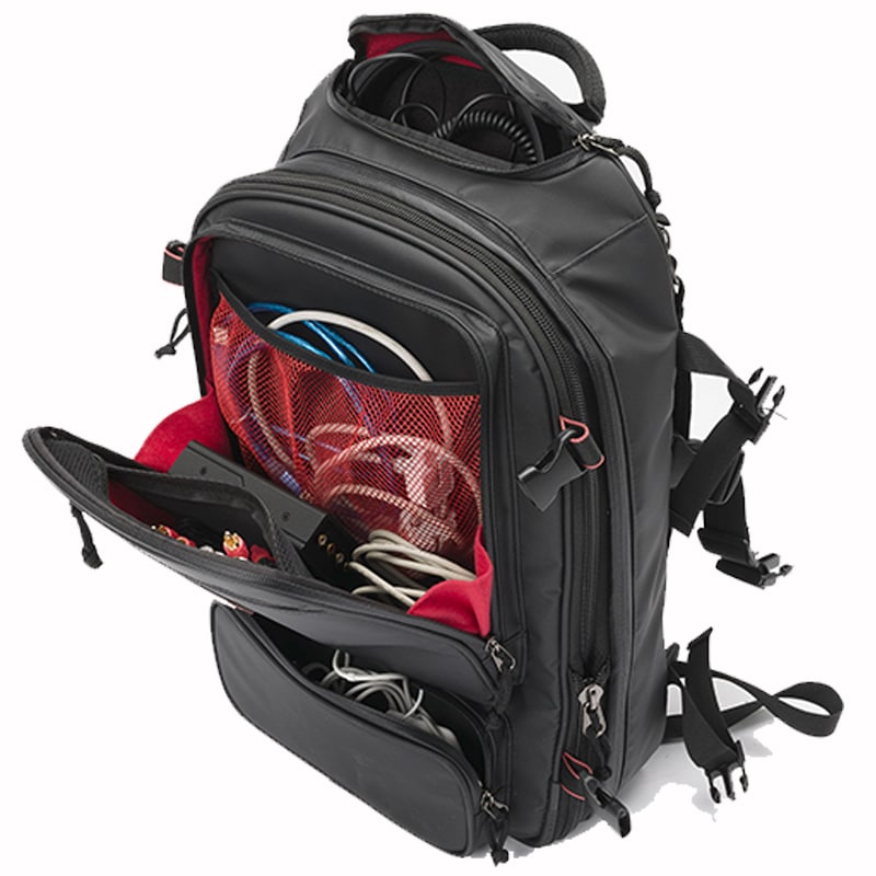 Disposición interior versátil con dos divisores removibles. Compartimento principal puede desplegarse completamente. Bolsillos interiores colgantes de rejilla para auriculares, cables y pequeños dispositivos con acceso por cremallera separado.
