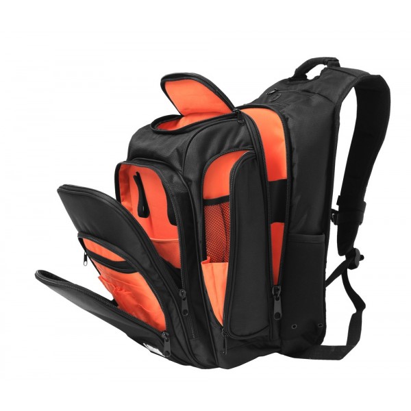 Digi BackPack Orange Inside ha sido diseñada pensando en el Laptop DJ y sus necesidades ofreciendo una gran cantidad de compartimentos para transportar todo tu material de una forma organizada y cómoda.