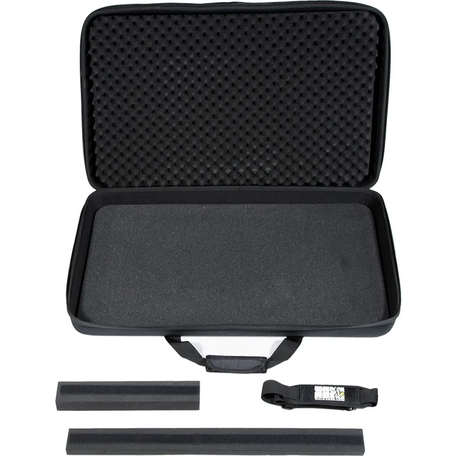 El interior de la tapa viene forrada con espuma ondulada de densidad 18kg/m3 y grueso de 3,5cm y la base con espuma plana de densidad 33Kg/m3 y grueso 1cm. Incluye dos modos de transporte: 1) asas nylon acolchada de mano, 2) cinta de transporte para hombro desmontable.