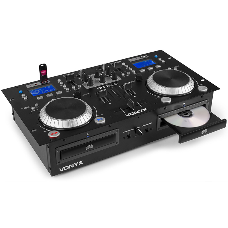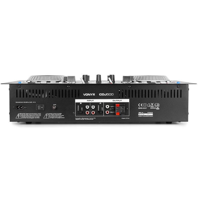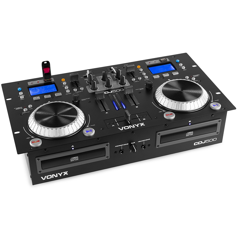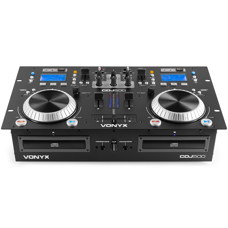 Vonyx CDJ 500 es una combinación de un doble reproductor media con un amplificador integrado (2 x 100W) y mezclador para reproducir y mezclar pistas desde CD, USB o via Bluetooth. Las dos pantallas de LCD informan del ID3 tag con titulo , artista y álbum en reproducción. Incorpora mezclador DJ de 2 canales, crossfader, ganancia y 2 jog wheels ergonómicos. El reproductor se completa con búsqueda de carpetas, selección de pistas, programación, Reverse/Brake/Scratch y control Pitch. Perfecto para el DJ moderno!