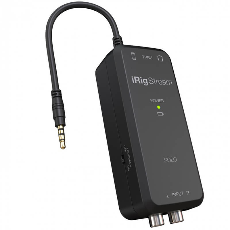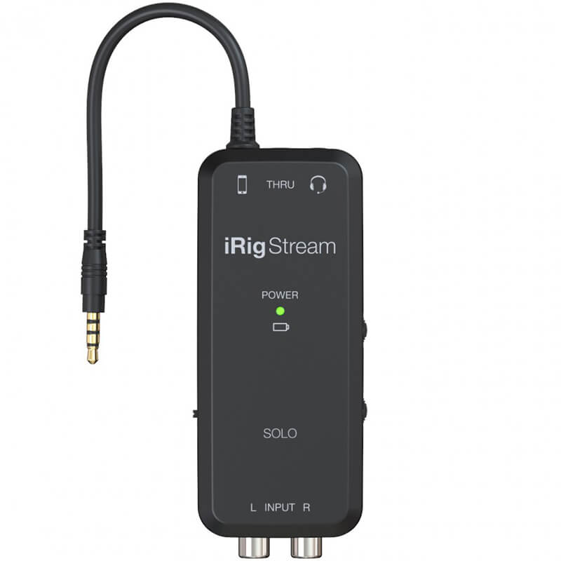 IK MULTIMEDIA iRig Stream Solo es una interfaz de audio fácil de usar para iPhone*, iPad y Android que te permite conectar hasta 3 fuentes distintas y mezclarlas en tu transmisión. Conecta mezcladores o teclados, tus auriculares o micrófonos iRig, e incluso el audio que se reproduce directamente en tu dispositivo, y mézclalos en una señal que es optimizada para transmisión y enviada directamente a tus aplicaciones favoritas.